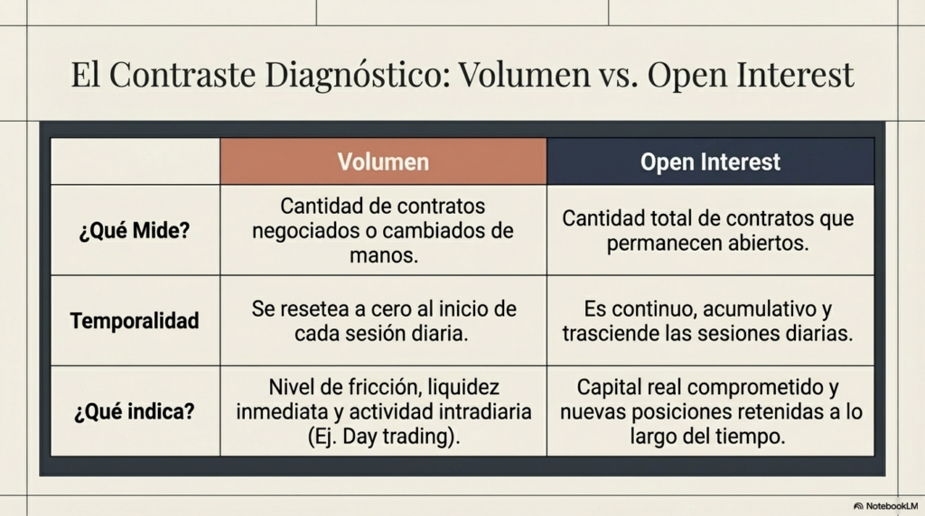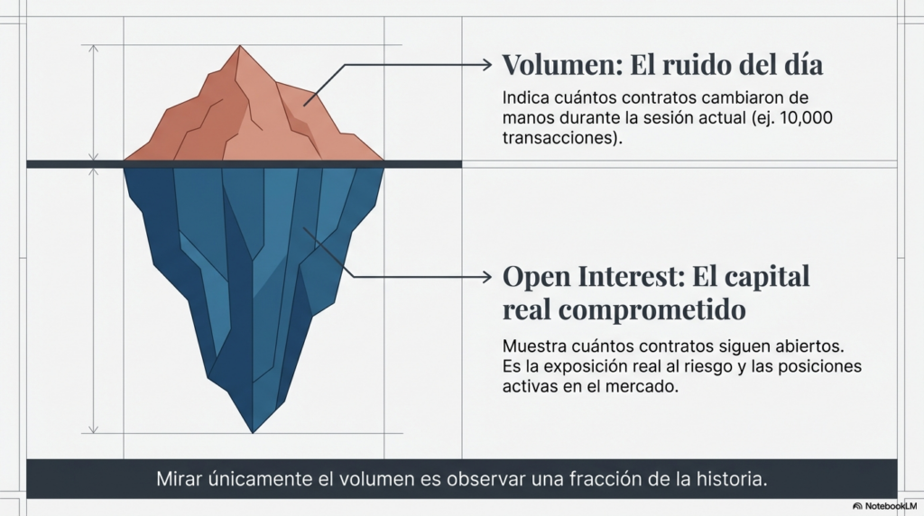 A diferencia del volumen, el open interest no mide transacciones realizadas durante el día. Mide posiciones que permanecen abiertas.