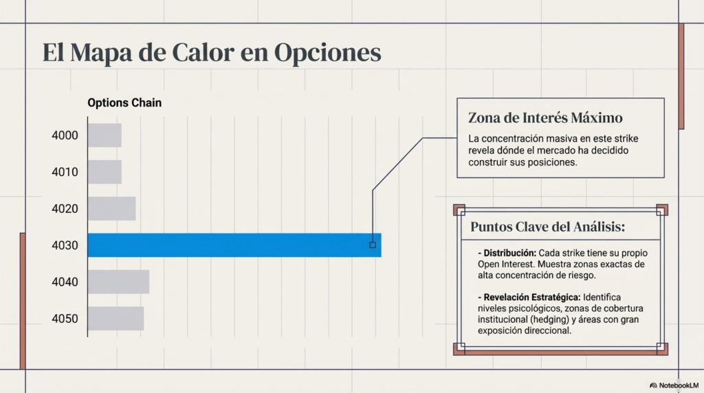 Este tipo de información ayuda a comprender cómo se posiciona el mercado y dónde existe mayor exposición en opciones.