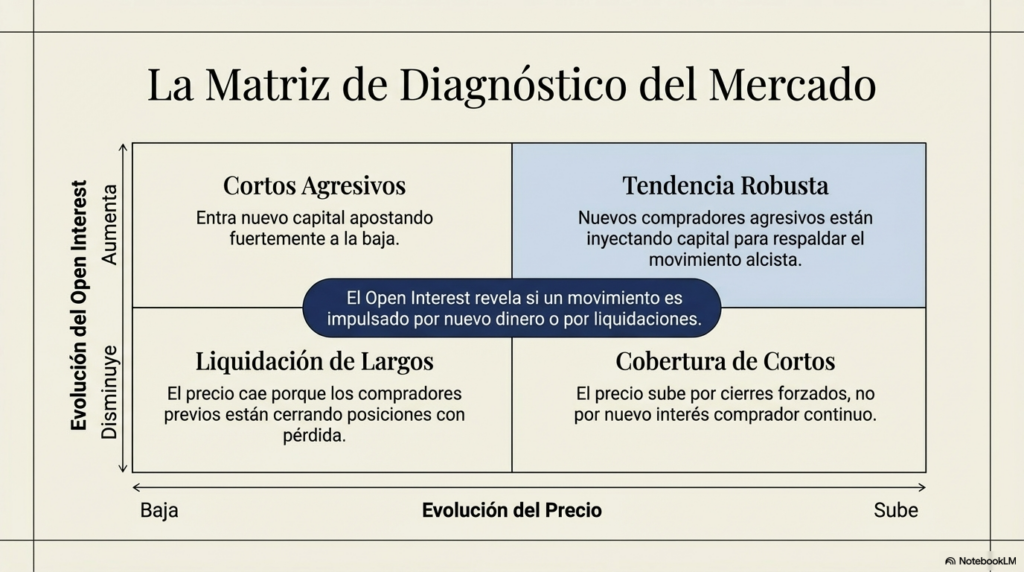En cambio, un aumento sostenido del open interest indica que nuevas posiciones permanecen abiertas en el mercado.