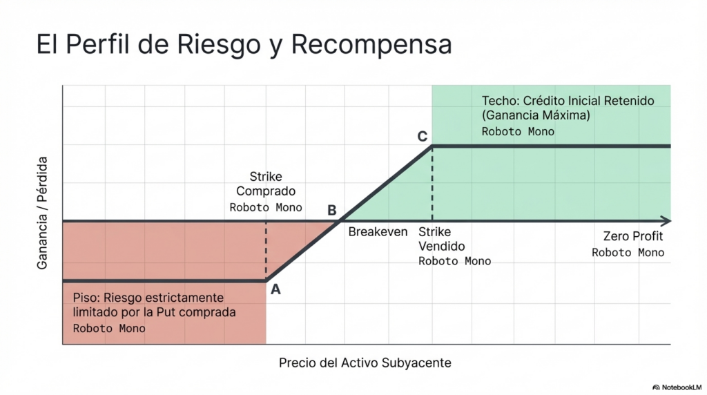 Si el precio del activo desciende por debajo del strike vendido, el spread comienza a perder valor. Sin embargo, la put comprada limita la pérdida máxima.
