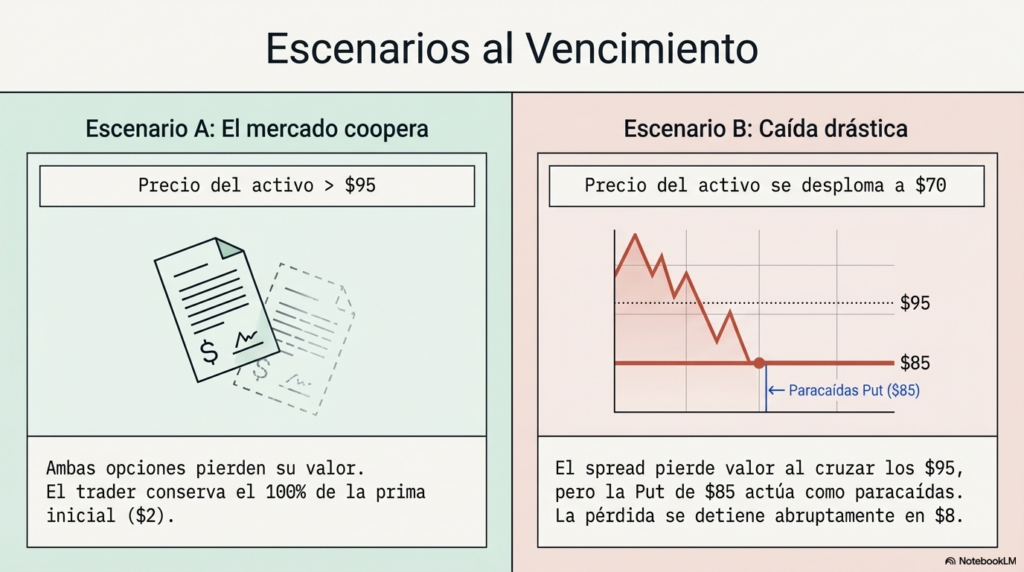 Si al vencimiento el precio se mantiene por encima de 95, ambas opciones pierden valor y el trader conserva la prima inicial.