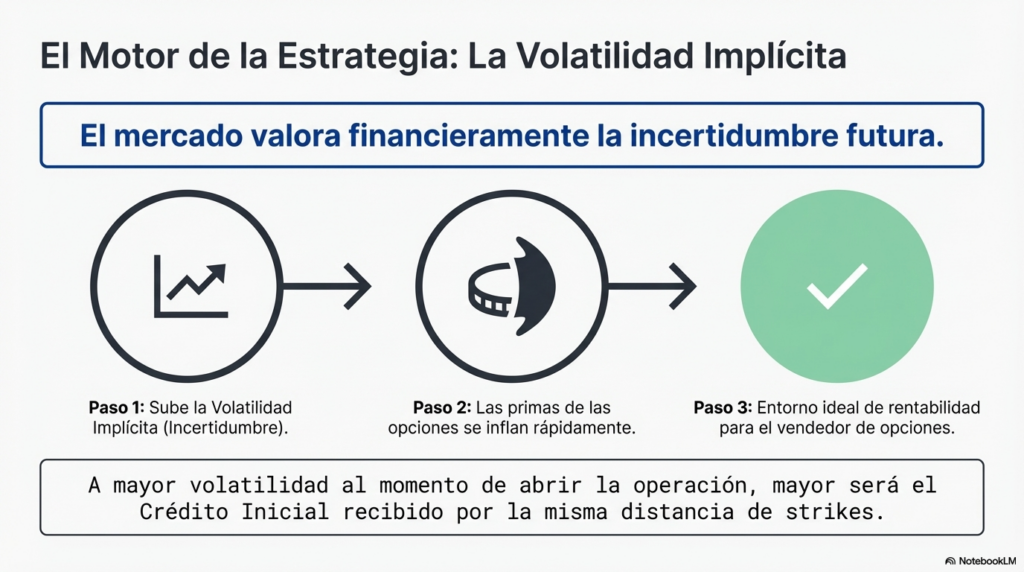 Un nivel elevado de volatilidad implícita permite construir spreads que reciben mayor crédito inicial.