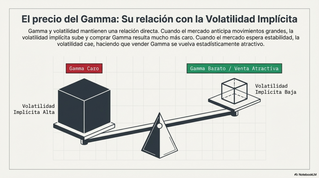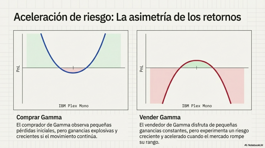 Comprar gamma significa tener posiciones que ganan convexidad cuando el precio se mueve.
