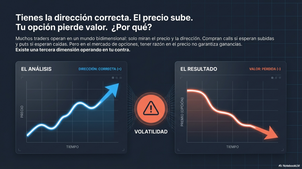 El movimiento del activo subyacente es una de ellas. El paso del tiempo también influye. Y existe un factor clave que muchos traders descubren cuando ya operan opciones: la volatilidad implícita.