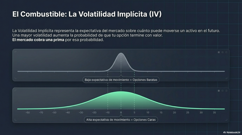 La volatilidad implícita representa la expectativa del mercado sobre cuánto puede moverse un activo en el futuro.