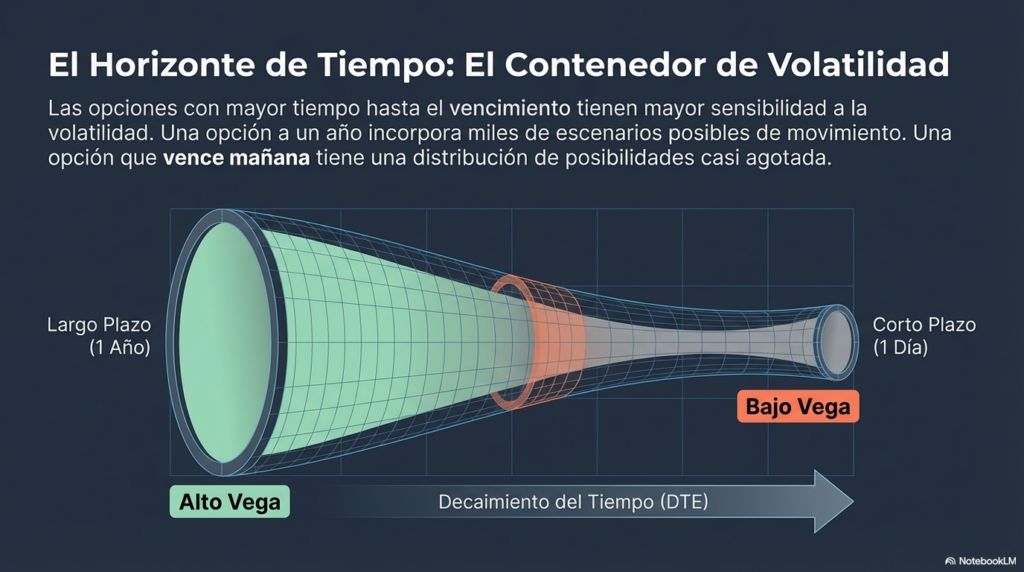 Cuanto más tiempo queda hasta el vencimiento, mayor es el impacto que puede tener la volatilidad futura en el valor de la opción.