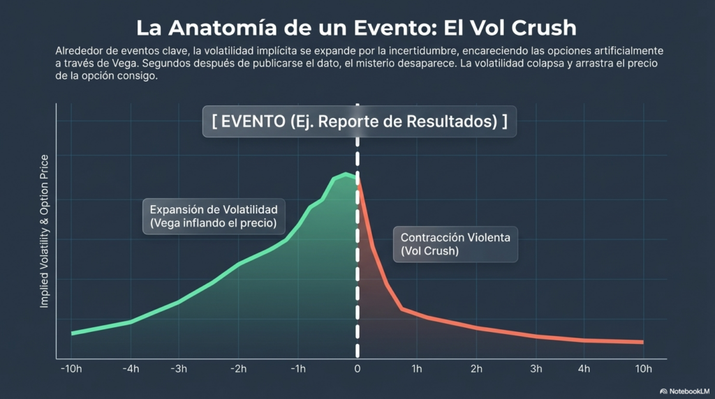 La volatilidad implícita suele expandirse antes del evento y contraerse después.