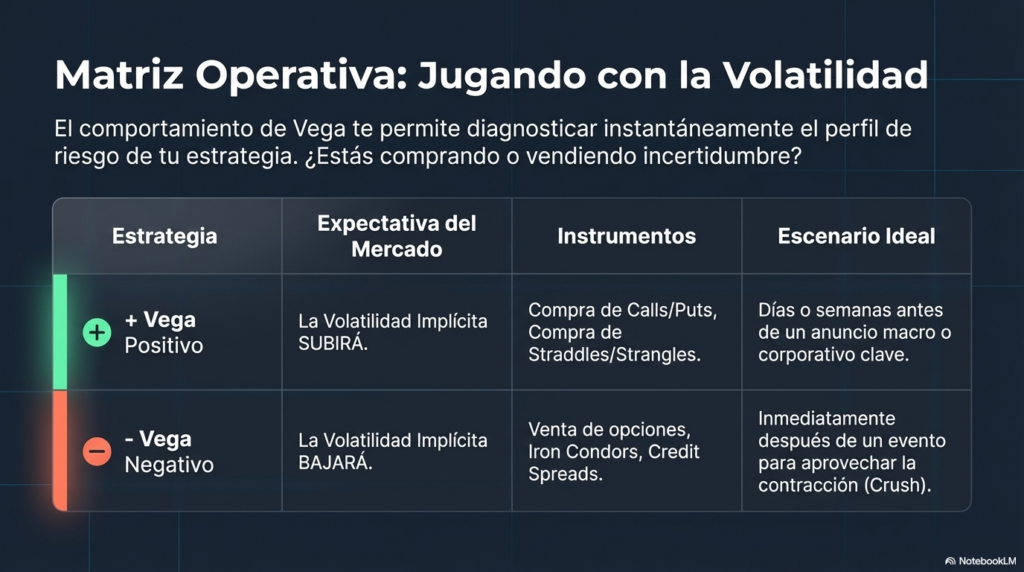 Una posición con Vega positivo gana valor cuando la volatilidad implícita sube.