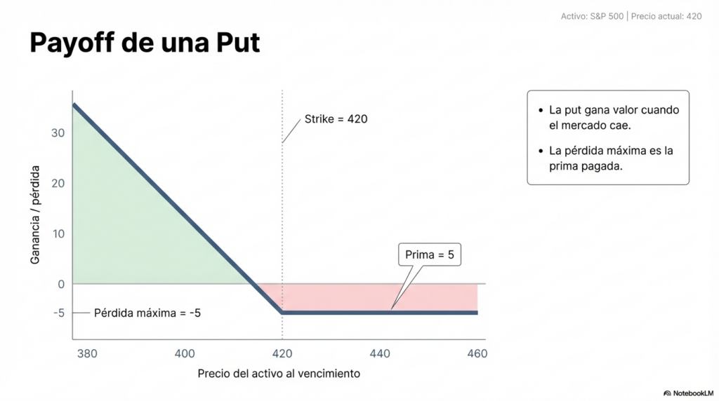 Si el precio del mercado cae, el put gana valor y compensa esa caída.