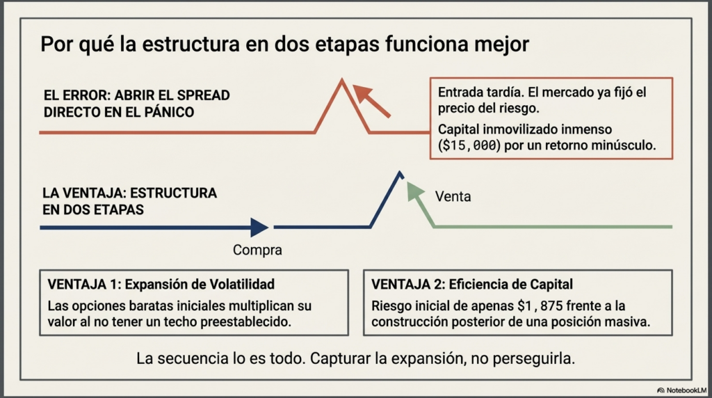 El objetivo es entender cómo se construye una operación de volatilidad en dos etapas y por qué ese enfoque ofrece una ventaja frente a abrir un spread directamente cuando el mercado ya está en pánico.