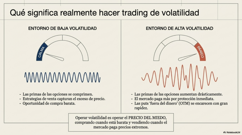 El trading de volatilidad consiste en operar el precio de la volatilidad implícita, no solamente la dirección del mercado.