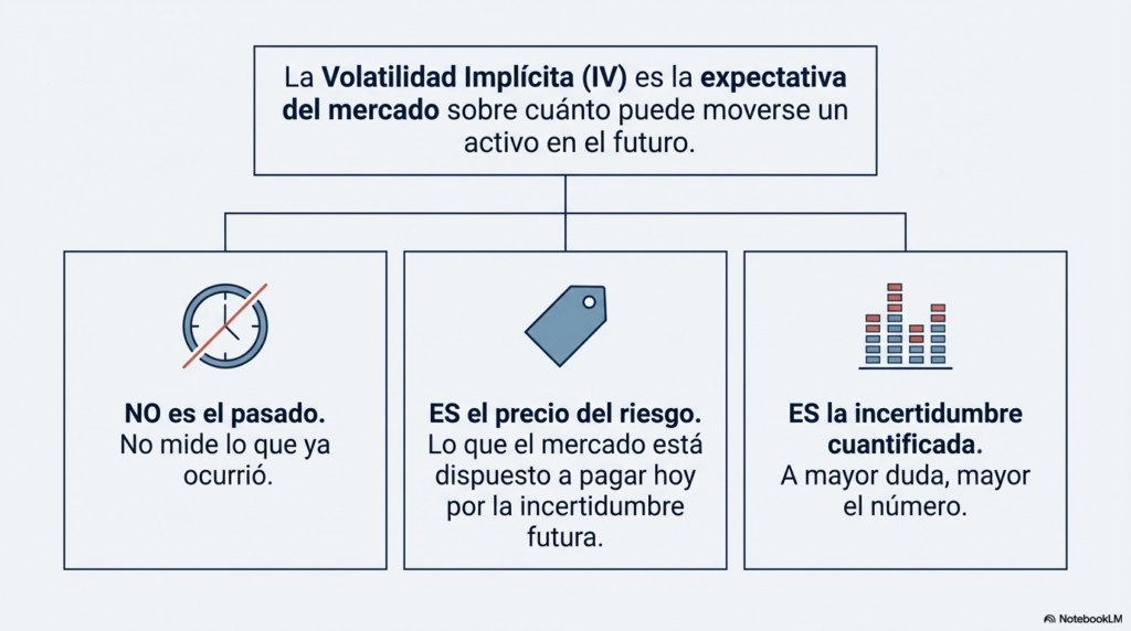 La volatilidad implícita representa la expectativa del mercado sobre cuánto puede moverse un activo en el futuro.