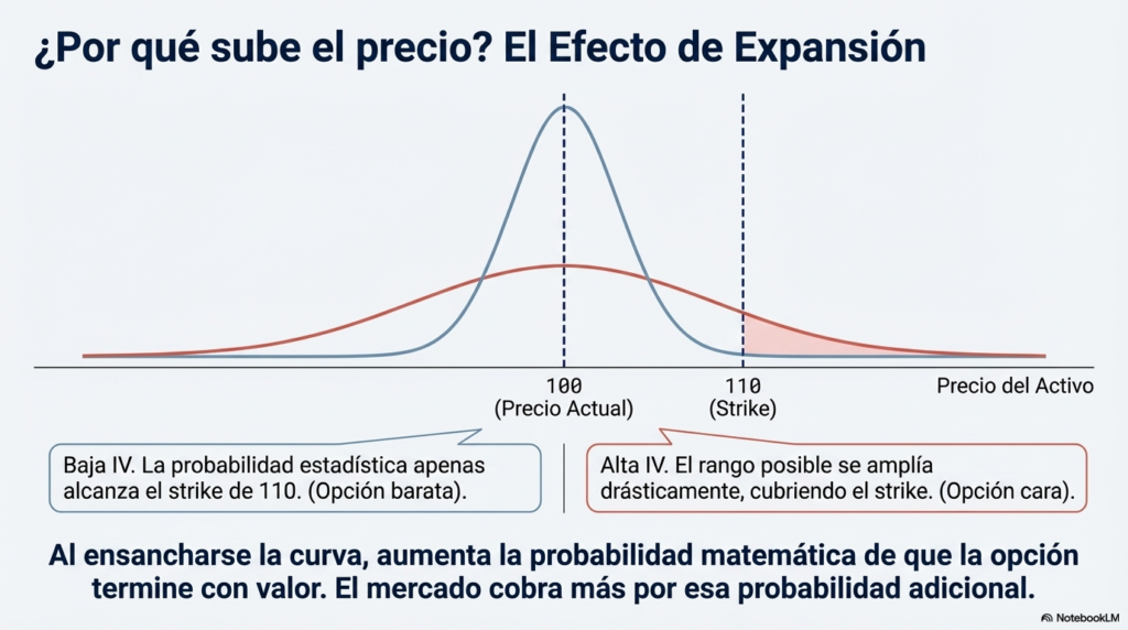 Cuando la volatilidad implícita aumenta, la distribución posible de precios se amplía. Ese escenario aumenta la probabilidad de que la opción termine con valor.